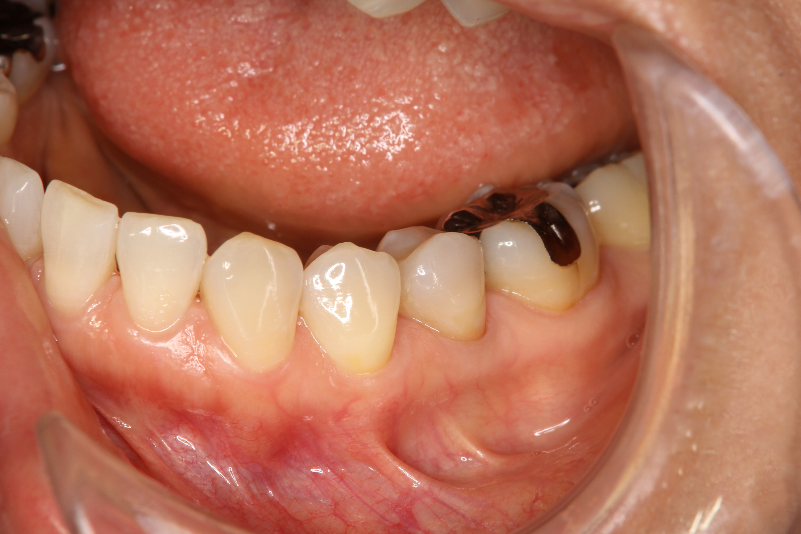 この患者さんは、手前の銀の詰め物が入っている歯に違和感があるということで来院されました。