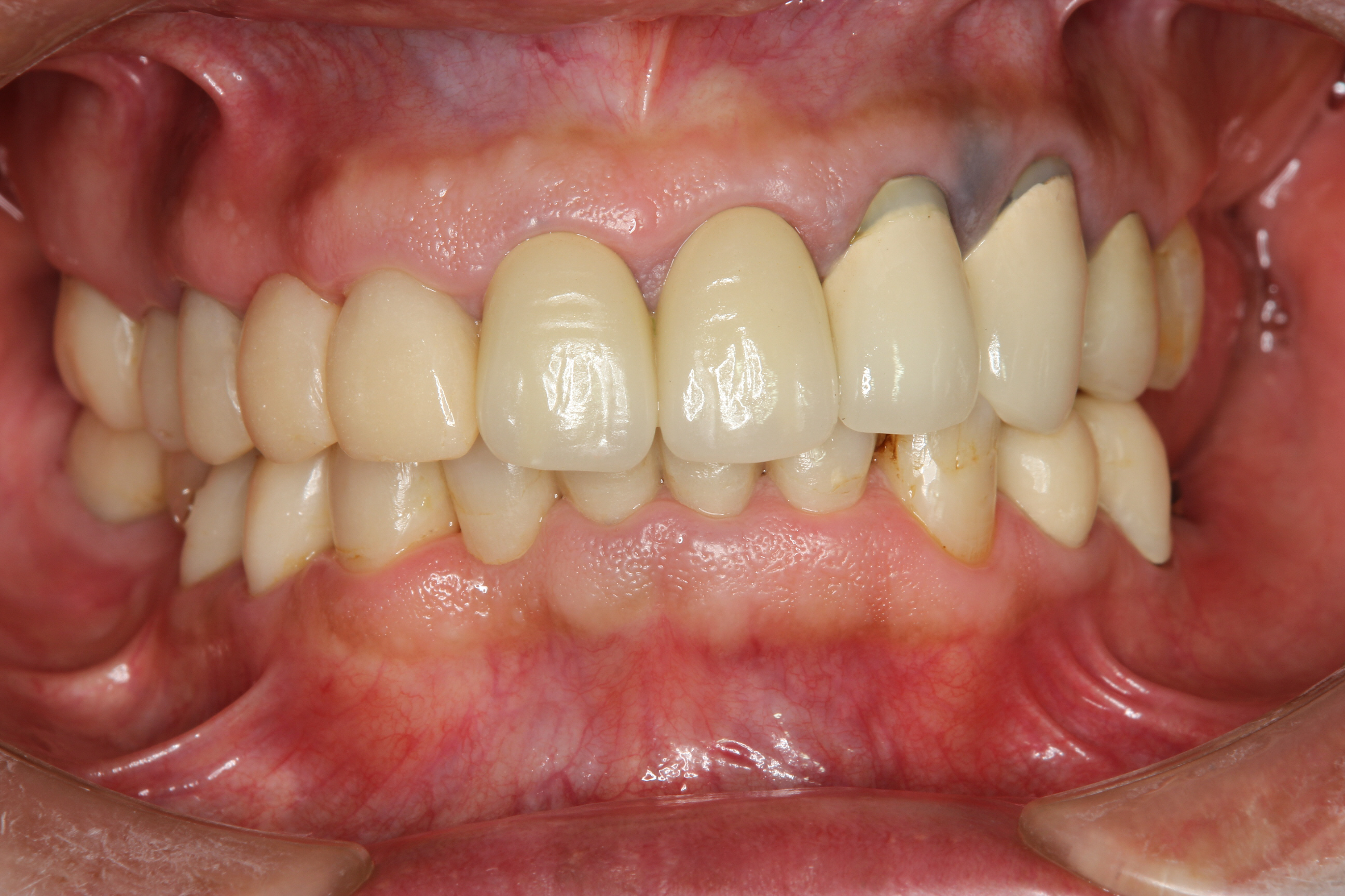 下の写真は、インプラントを埋入し上顎の一部の前歯を除きすべての歯に仮歯を装着した状態です。