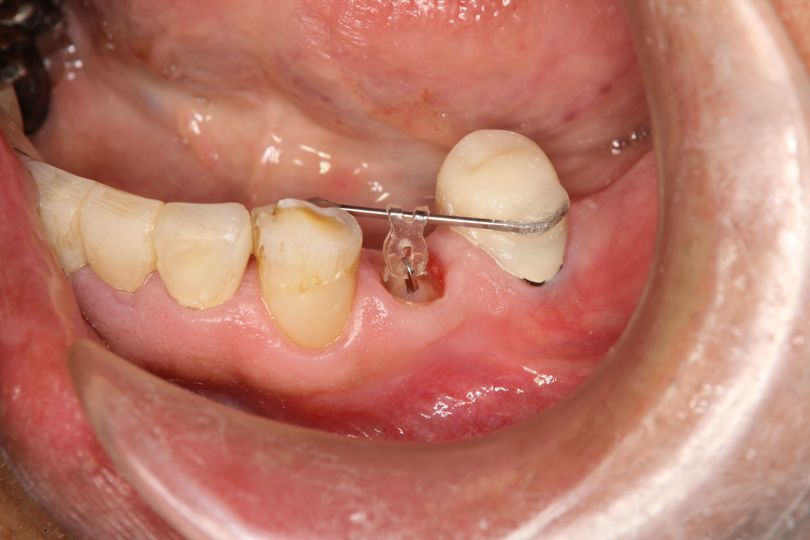 辺縁骨より下方にむし歯が進行しており、抜歯と判断されるかもしれない歯に対しては、矯正を行うことで歯を挺出(歯を引き出す)し、クラウンを装着できるようにしました。