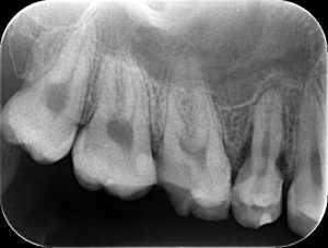 移植歯の後方の第1大臼歯に根尖病変が認められたため、その後根管治療を行いました。