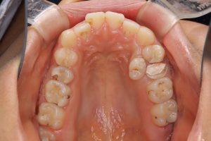 来院した時はまだ10代の患者さんでしたが、むし歯が多く、左上の2本の小臼歯にもむし歯が認められ、後方の第2小臼歯は歯髄(神経)に達する程進行していました。そして、内側には過剰歯が存在していました。