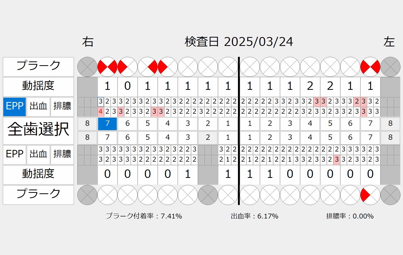 歯周組織検査を行うと、30代にもかかわらず、中等度から重度の歯周ポケットを多数認めました。
