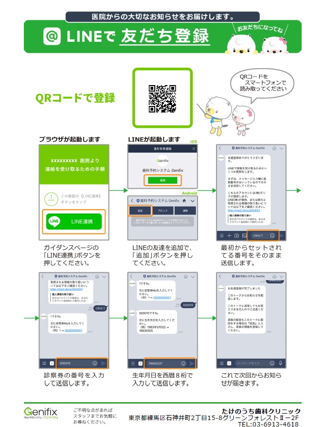 予約の確認や予約の事前通知などもできますので、たけのうち歯科クリニックLINE公式アカウントへの登録をよろしくお願い致します。