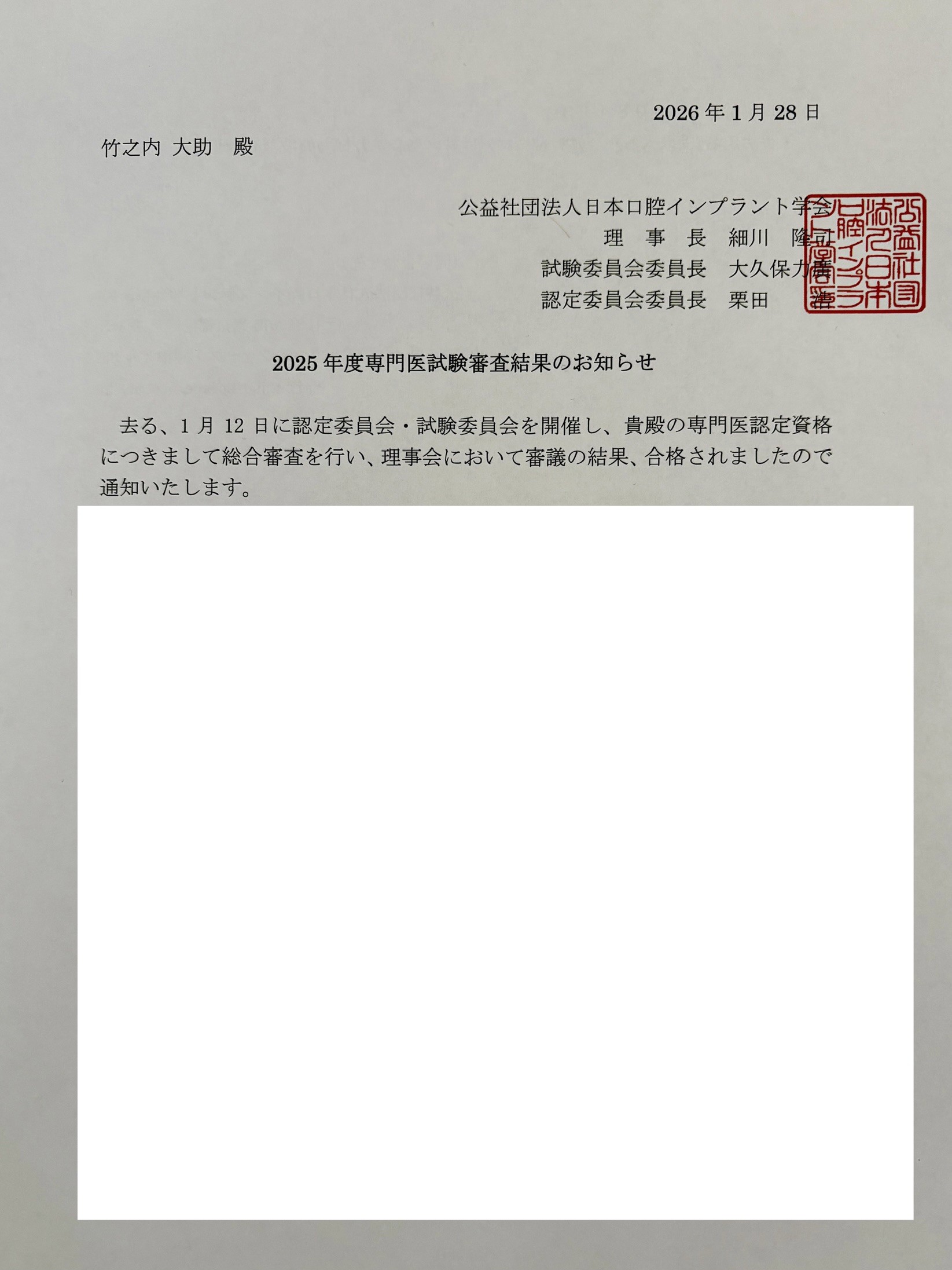 症例・論文業績・研修・学会参加などの書類審査後、1月12日に試験官の前でのケースプレゼンテーションとインプラントに関する筆記試験と口頭試問を受け、先日、合格の通知が届きました。