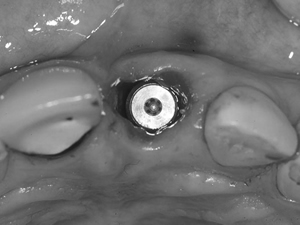 インプラントが骨と結合した後に、アバットメントを装着しました。左のクラウンも除去しています。